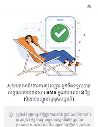 សូមមេត្តារងចាំការអនុម័ត អ្នកនឹងទទួលបានសារ SMS បញ្ជាក់ពីលទ្ធផលការចុះឈ្មោះ