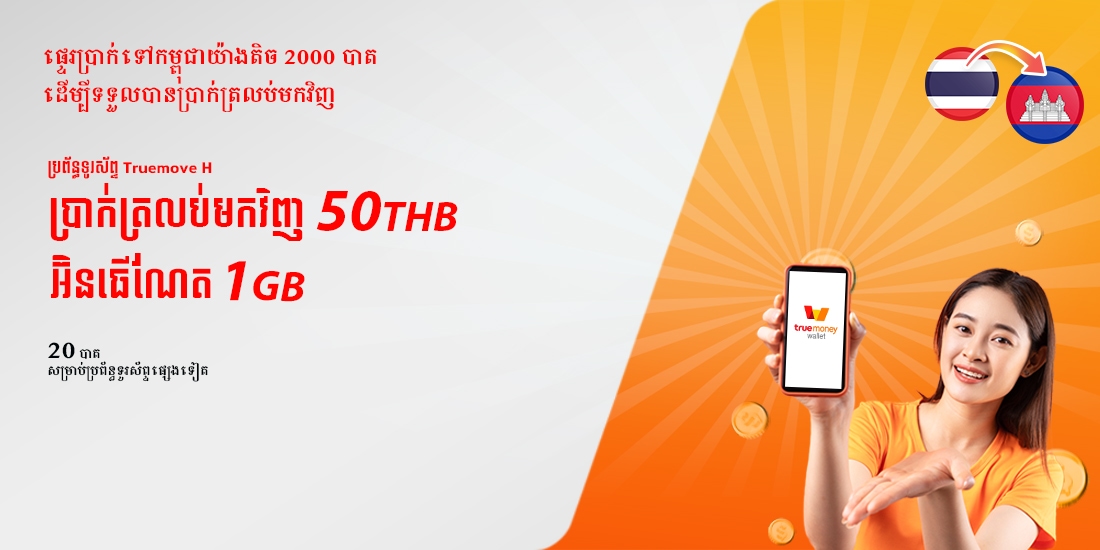 ធ្វើការផ្ទេរប្រាក់ទៅកាន់ប្រទេសកម្ពុជា និង ទទួលបានប្រាក់ត្រលប់មកវិញ ចំនួន 50 បាត និង អ៊ិនធើណែត 1 GB សម្រាប់អតិថិជន TrueMove H ឬ 20 បាត សម្រាប់អតិថិជនដែលមិនបានប្រើ TrueMove H