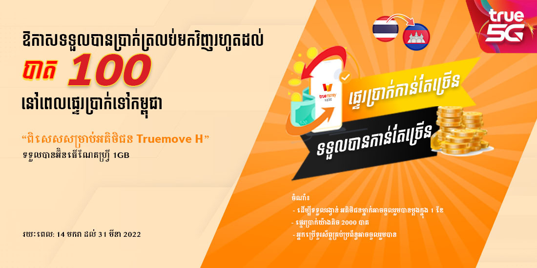 - ប្រាក់ត្រឡប់មកវិញច្រើនបំផុត 100 បាត និងអ៊ិនធើណែត 1 GB សម្រាប់អតិថិជន Truemove H ឬ 80 បាតសម្រាប់អតិថិជនដែលមិនប្រើ TrueMove H