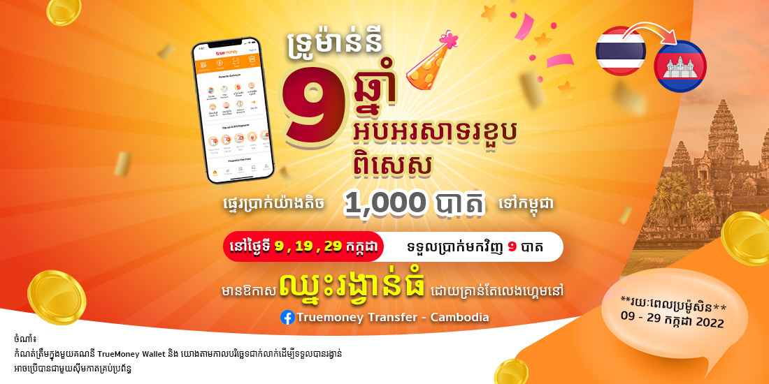 1. អ្នកផ្ញើដែលបានធ្វើការផ្ទេរប្រាក់ដោយជោគជ័យទៅកាន់អ្នកទទួលនៅប្រទេសកម្ពុជាតាមអេប TrueMoney Wallet តាមកាលបរិច្ឆេទដែលបានកំណត់នឹងមានសិទ្ធិទទួលបានប្រាក់មកវិញ 9 បាត។