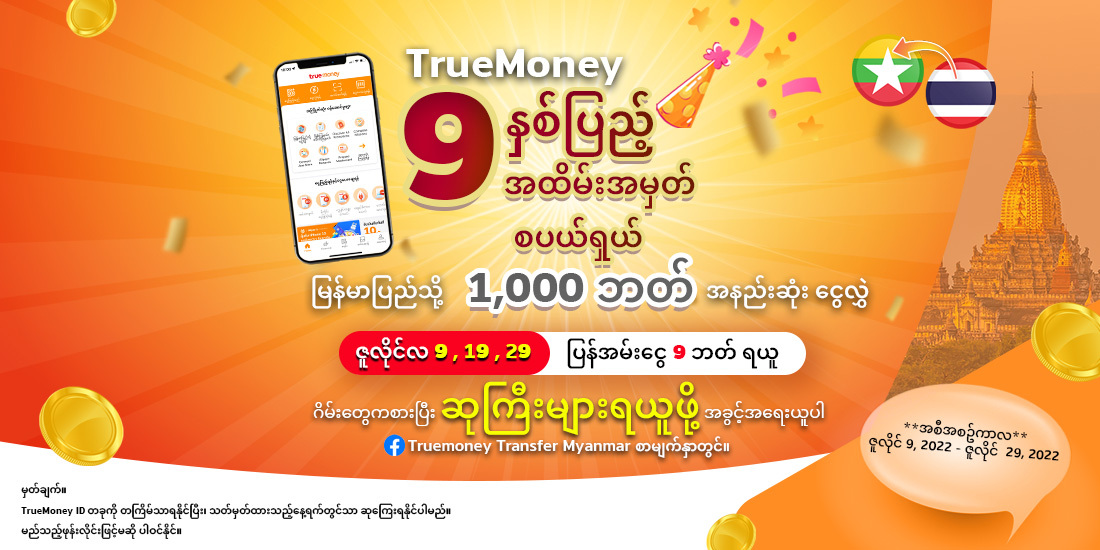 1. သတ်မှတ်ထားသောရက်စွဲတွင်TrueMoneyဝေါလပ်အက်ပလီကေးရှင်းမှတစ်ဆင့် မြန်မာနိုင်ငံသို့ငွေလွဲမှုအောင်မြင်လျင် ပြန်အမ်းငွေ 9 ဘတ် လက်ခံရရှိမည်ဖြစ်သည်။