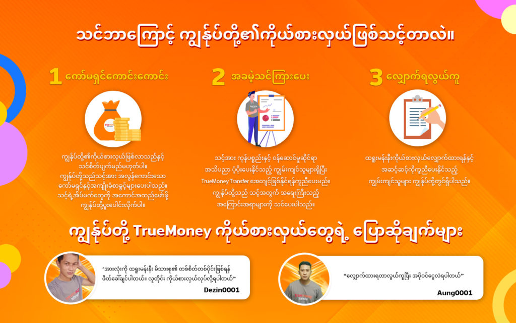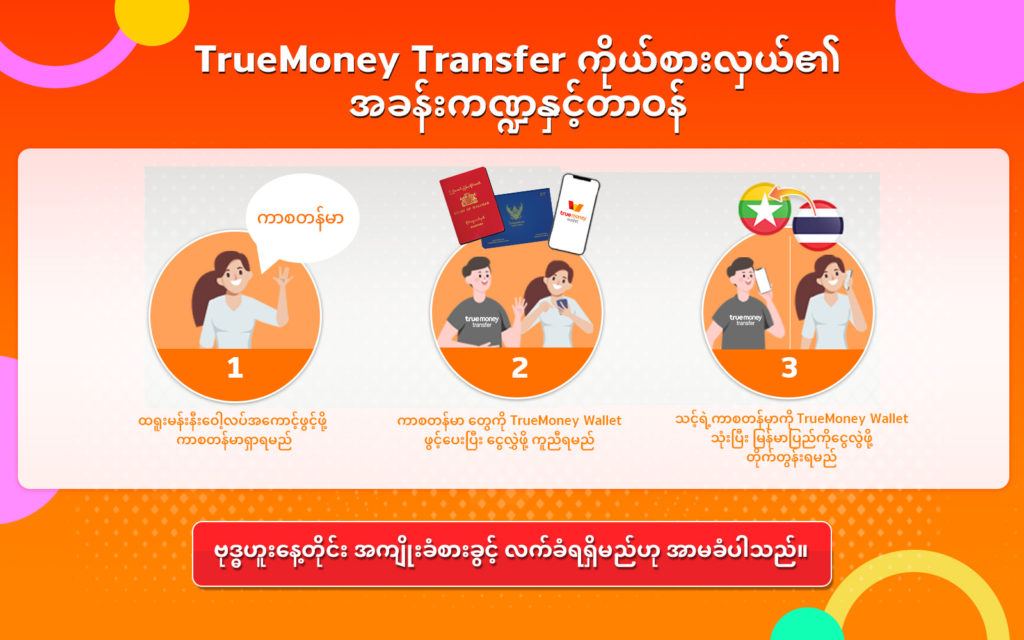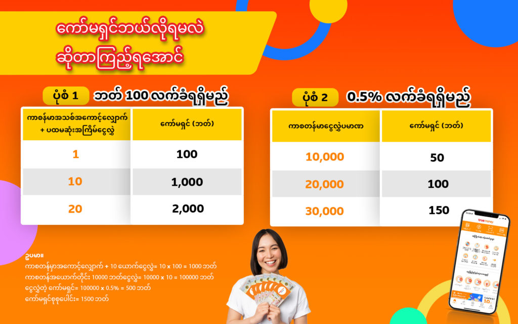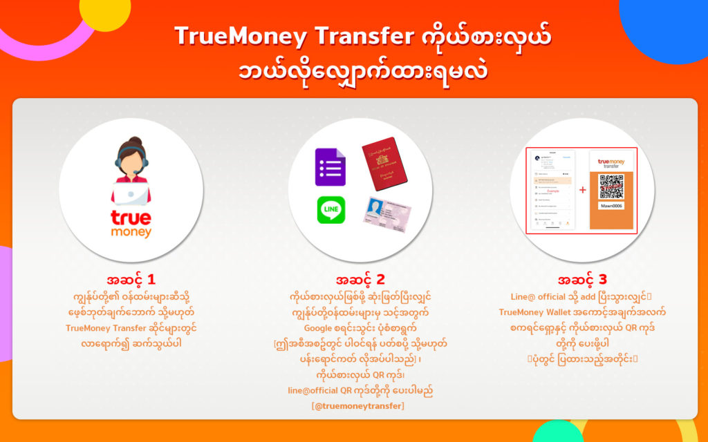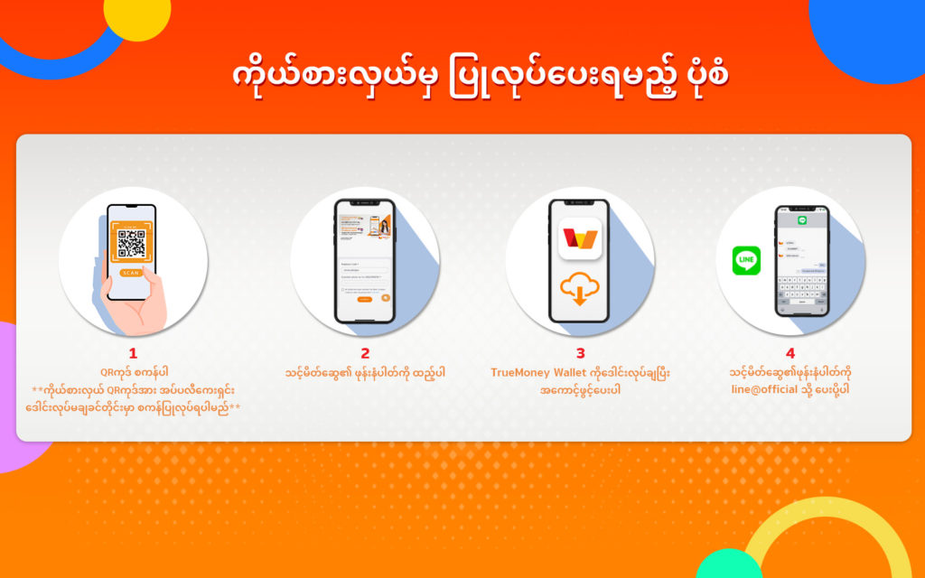 promotion-021 အခုပဲ လျှောက်လိုက်ပါ။ဆက်သွယ်ပါ သင်မရှင်းတာရှိပါသလား။ အဖြေများရှာရန် နှိပ်ပါ။ အောက်က ဗီဒီယိုလေးမျာ ဘယ်လို လျှေက်ထားရမလဲ ဆိုတာ ကြည့်လိုက်ပါ TrueMoney Transfer နဲ့အတူ လွယ်ကူစွာ လေ့လာကြည့်ကြစို့ https://www.youtube.com/channel/UCKwDqJWSQ2Geq983LEtsgYQ FAQS မေး : ဒီအစီအစဉ်မှာ ဘယ်သူတွေ ပါဝင်နိုင်မလဲ။ ? ဖြေ : အသက် 18 နှစ်အထက်ရှိသူတိုင်း ဤအစီအစဉ်တွင် ပါဝင်နိုင်ပါသည်။ မေး: ဒီအစီအစဉ်ကိုဘယ်လိုလျှောက်ရမလဲ။? ဖြေ: ကျွန်ုပ်တို့၏ Truemoney Transfer Myanmar Facebook messenger သို့မဟုတ် Truemoney ငွေလွှဲဆိုင်ခွဲသို့ ဆက်သွယ်ပါ။ မေး : Truemoney Transfer ကိုယ်စားလှယ်အစီအစဉ် ကိုလျှောက်ထားရန် မည်သည့်စာရွက်စာတမ်းလိုအပ်သနည်း။ ? ဖြေ : အလုပ်လုပ်ခွင့်စာအုပ်နှင့် နိုင်ငံကူးလက်မှတ်ရှိရန် လိုအပ်ပါသည်။ မေး : လျှောက်ထားပြီးနောက် သင်ရရှိမည့် အကျိုးခံစားခွင့် ဘယ်လိုရှိပါသနည်း။? ဖြေ: ၁. ကာစတန်မှာအသစ်များ အကောင့်လျှောက်(အကောင့်အောင်မြင်ပြီး Truemoney Wallet ထဲပြန်ဝင်ရမည်)လျှင် သင်ဘတ် ၅၀ ရရှိပါမည်။ ၂. သင့်ကာစတန်မှာများ ပထမအကြိမ် ငွေလွှဲပါက ဘတ် ၅၀ ရရှိပါမည်။ ၃. သင့်ကာစတန်မှာများ၏ ငွေလွှဲမှုပမာဏ၏ ၀.၅% ရရှိပါမည်။ မေး : အကျိုးခံစားခွင့်တွေ ဘယ်တော့ရရှိမည်နည်း? ဖြေ : ၁. ၅၀ ဘတ် Truemoney Wallet ကို အတည်ပြုပြီး အကောင့်ဝင်ပါ- အကျိုးခံစားခွင့်ကို TMN Wallet မှတစ်ဆင့် ဗုဒ္ဓဟူးနေ့တိုင်း ညနေ 6 နာရီအတွင်း ပေးချေမည်ဖြစ်ပါသည်။ * ဗုဒ္ဓဟူးနေ့သည် ကျွန်ုပ်တို့၏ အစိုးရရုံးပိတ်ရက်ဖြစ်ပါက အကျိုးခံစားခွင့်အား နောက်နေ့တွင် ပေးဆောင်ပါမည်။. ၂. ၅၀ဘတ် ပထမအကြိမ် ငွေလွှဲခြင်း- အကျိုးခံစားခွင့်ကို လကုန်တွင် (တစ်လလျှင် တစ်ကြိမ်) ပေးချေပါမည်။ ၃. ငွေလွှဲပမာဏ၏ ၀.၅% : အကျိုးခံစားခွင့်ကို လကုန်တွင် (တစ်လလျှင် တစ်ကြိမ်) ပေးချေပါမည်။ မေး :ဘယ်မှာ ငွေထုတ်လို့ရပါသလဲ ဖြေ : ဒီလင့်ခ်လေးထဲဝင်ကြည့်ပြီး ငွေထုတ်နိုင်တဲ့ နေရာများကို တွေ့ရှိနိုင်ပါတယ် https://truemoney.com.mm/brand-shop/ Line@official QR code [@truemoneytransfer] ကျွန်ုပ်တို့၏ ကိုယ်စားလှယ်အဖြစ် လျှောက်ထားပါ။ user2022-05-23T07:34:55+00:00